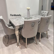 Elevate your dining experience with the luxurious 1.5 Meter Grey Marble Dining Table, perfectly paired with four elegant grey chairs. This striking set combines sophistication and contemporary design, making it a stunning focal point for any dining area.